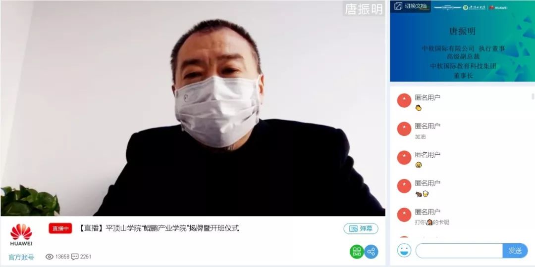 唐振明表示,在全国新冠肺炎疫情的特殊情况下,平顶山学院“鲲鹏产业学院”揭牌有着里程碑意义,中软国际教育科技集团倾力研发集学习、实验、实训为一体的智慧教学云平台为这次鲲鹏产业学院线上培训提供全方位、多维度线上教学支撑,有效的保障了高校停课不停学。此次平顶山学院“鲲鹏产业学院”成立是中软国际与华为合作、与高校合作的一个重要案例,我们将以此为标杆,不断深化产教合作。