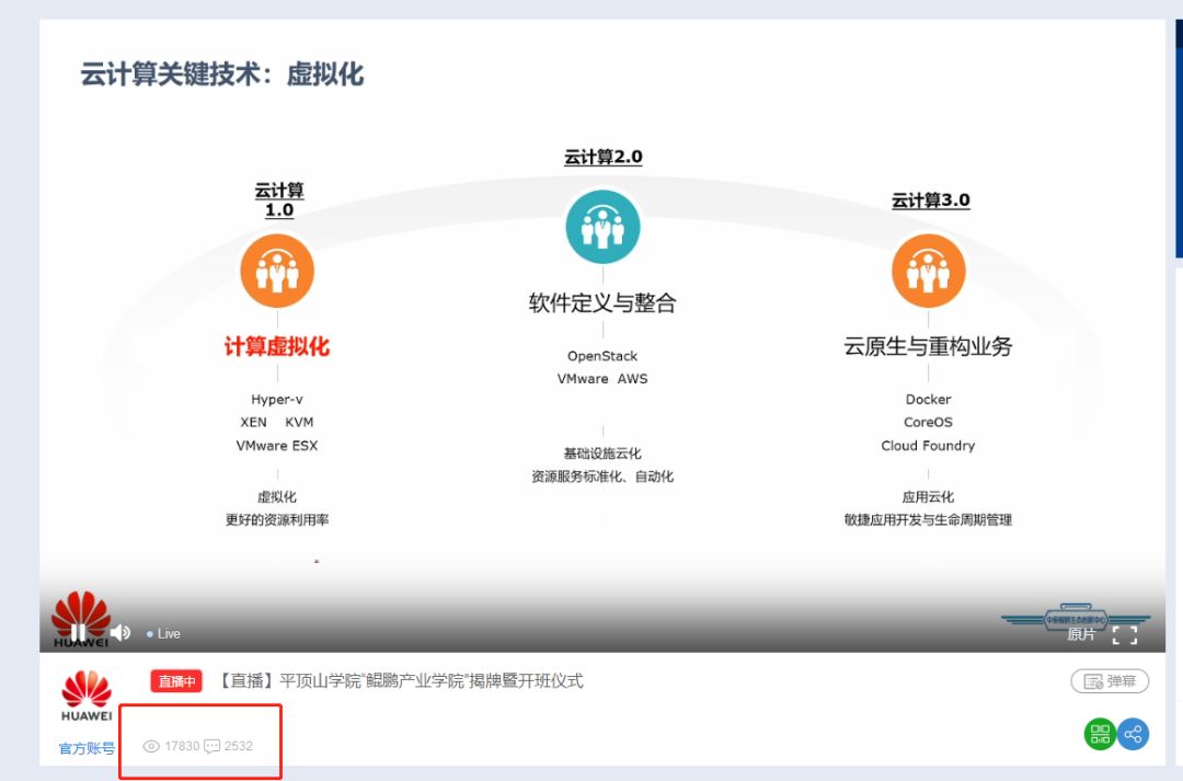 开班仪式后,首批平顶山学院学生在线收看了由中软国际教育科技集团卓越研究院副院长、资深华为鲲鹏认证专家杨强讲授的专业课程。河南多所高校组团观看,首堂课程吸引了一万七千余人在线听讲。