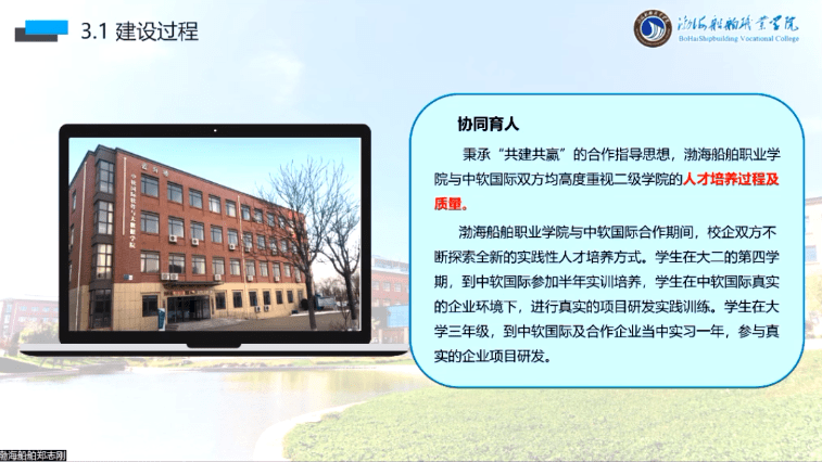 2017年渤海船舶职业学院与中软国际教育开始校企合作订单培养,共建数字媒体应用技术,软件技术专业。双方倾力协作,共同培养IT软件人才,高质量、高薪资的就业赢得了学校、企业、学生、家长多方满意的结果。2021年11月,辽宁省教育厅公布辽宁省职业教育兴辽产业学院名单,首批认定50个产业学院为辽宁省职业教育兴辽产业学院。渤海船舶职业学院与中软国际教育联合申报的大数据产业学院成功入选首批辽宁省职业教育兴辽产业学院建设项目名单。