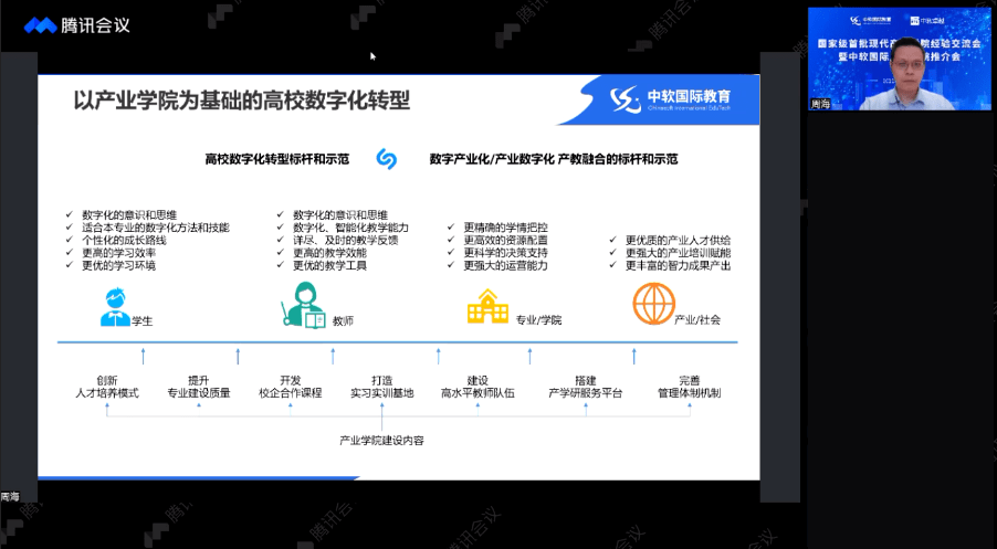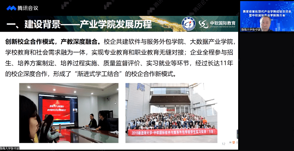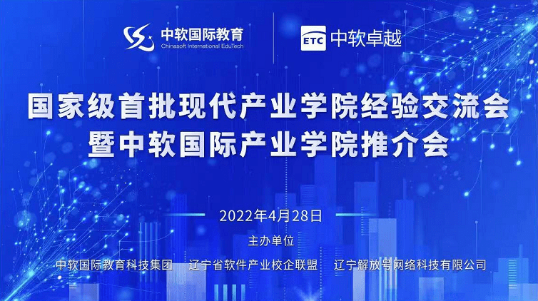 2022年4月28日,由中软国际教育科技集团、辽宁省软件产业校企联盟、辽宁解放号网络科技有限公司联合主办的“国家级首批现代产业学院经验交流会暨中软国际产业学院推介会”在线举行。会议围绕特色软件学院建设与发展、国家级现代产业学院实践、兴辽产业学院建设经验、中软国际教育现代产业学院实践经验、企业用人需求等多个议题展开深入的讨论。
