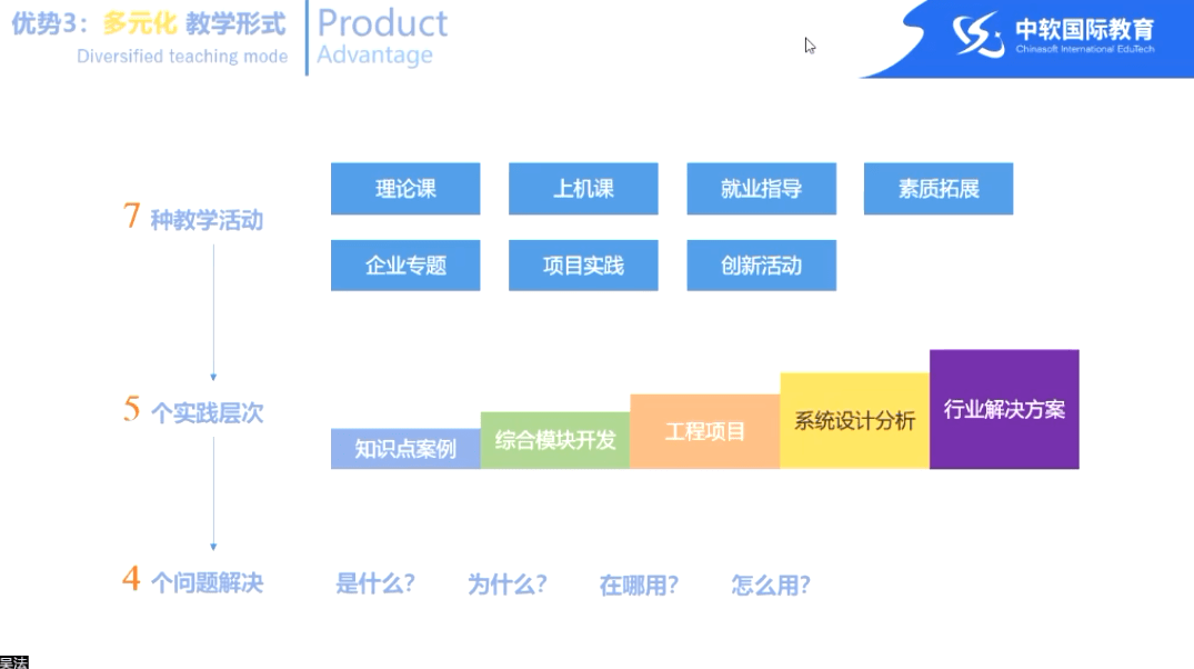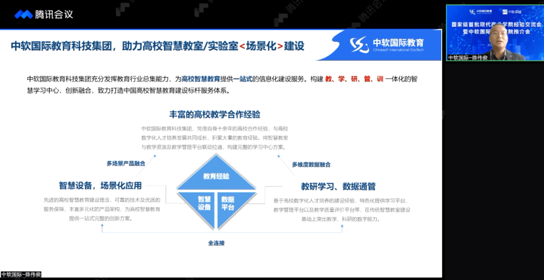 优秀IT人才的培养离不开优质的教学资源、多样的教学设施及丰富的实验条件,中软国际教育在实验室建设方面累计了多年的经验,与众多高校长期合作。中软国际教育科技集团产品与供应商管理部产品总监陈伟俊带来“智慧教室/实验室高校解决方案”介绍。
