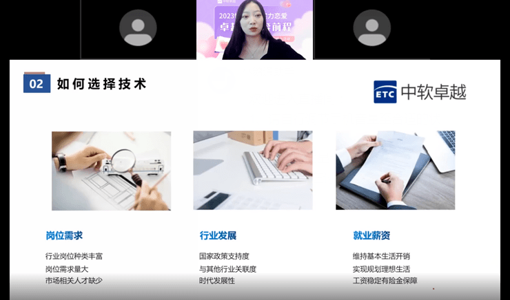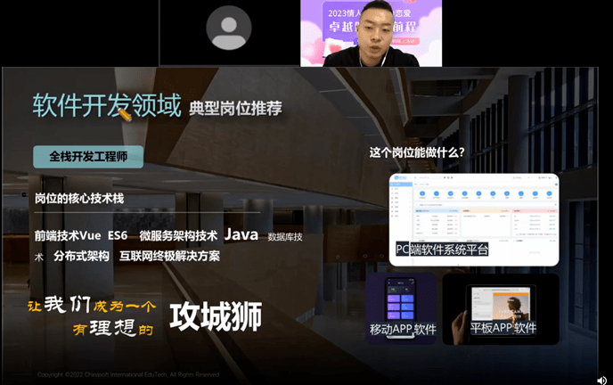 第二部分公开课,是中软国际教育集团宅客学院产品线就业督导杨铁锌老师带来的《卓越不停步!中软卓越助你决胜高薪岗位》主题分享。报告介绍了数字化时代下,企业需要怎样的人才;软件开发领域典型的岗位包括哪些;企业在招聘人才的时候关注重点等方面的专业解析。