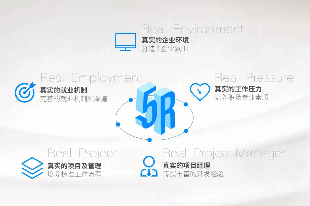 中软卓越坚持5R教学原则,用真实的工作体验让学员提前适应职场。实训学员在学习期间实训项目均来自企业真实项目。